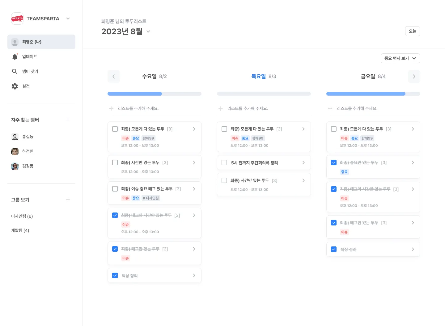 업무가 많은 팀장님들은 팀원들의 테스크 트랙킹할 시간이 부족하다는 말씀을 해주셨어요. 그래서 팀원들이 작성한 오늘 할 일의 업무 진척도를 파악하여 팀원들의 현황을 빠르게 파악할 수 있게끔 진척도바를 개발하였어요.