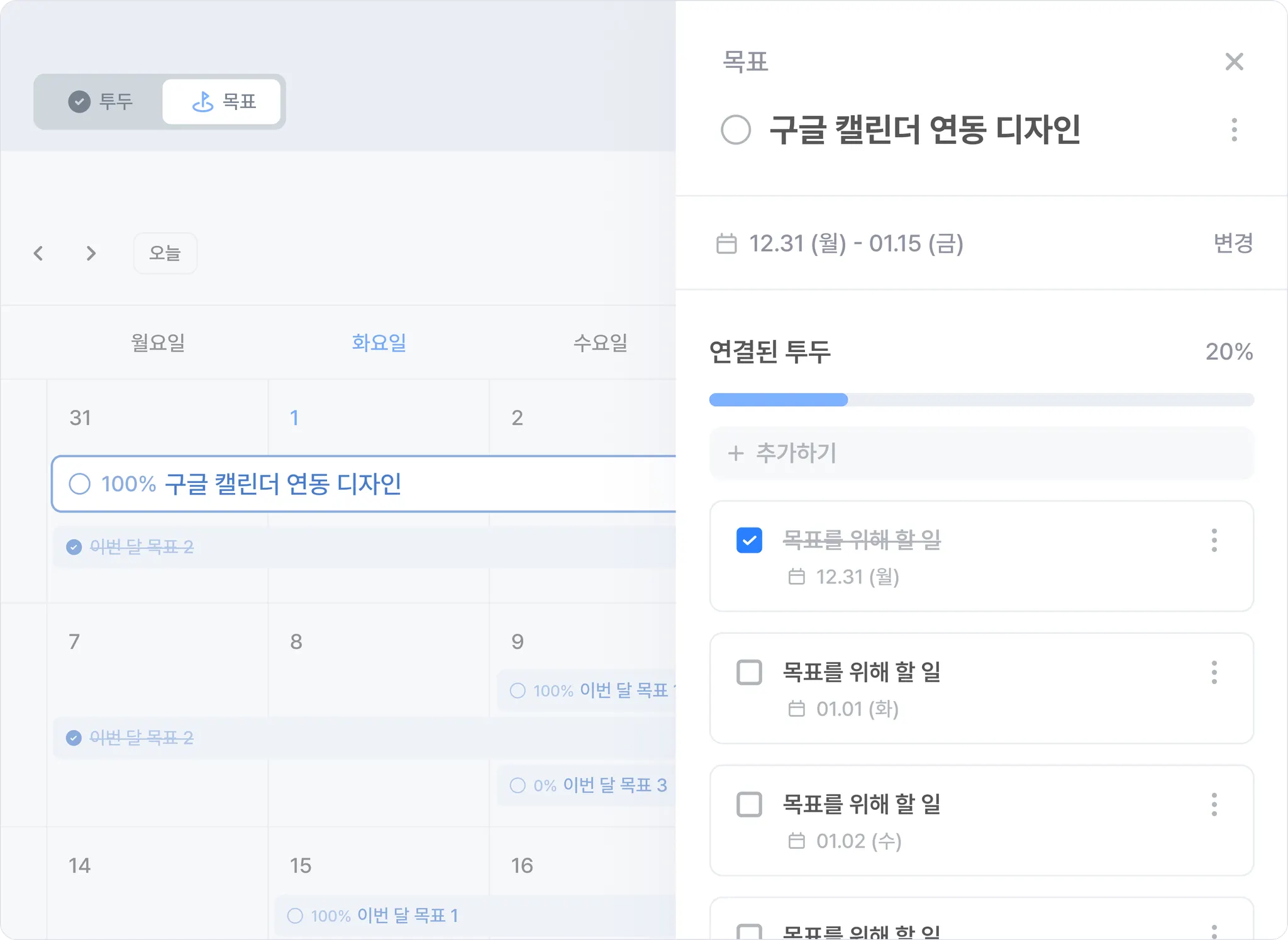 캘린더에서 1달 동안 작성해두신 목표들을 기반으로, 연결되어 있는 업무들을 확인하고 작성할 수 있어요.