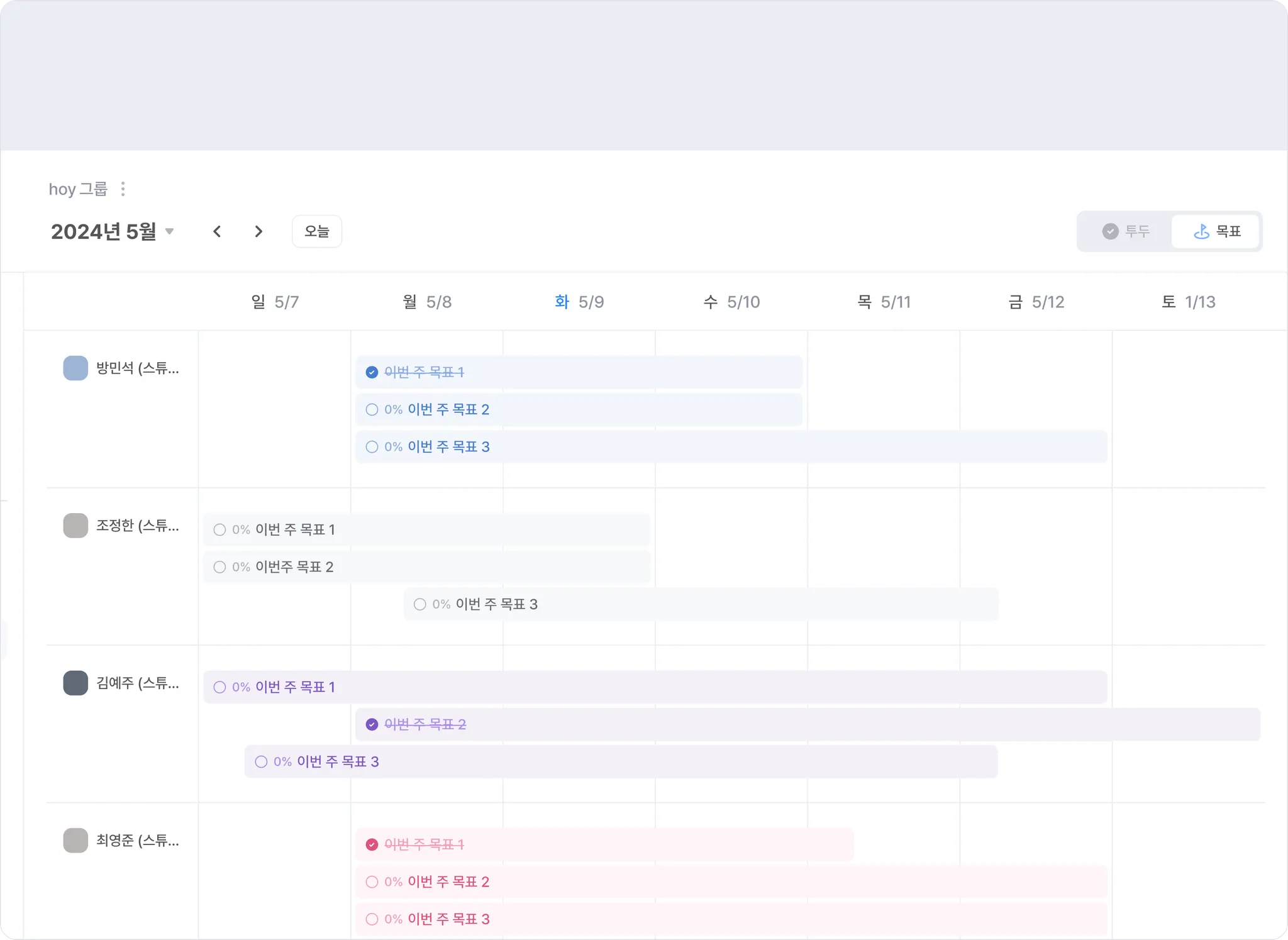 스크럼 보드(그룹보기)에서는 주간 뷰를 통해 팀원들의 목표들을 기반으로, 어떤 업무들을 매일 진행하고 있는지 확인하실 수 있답니다.