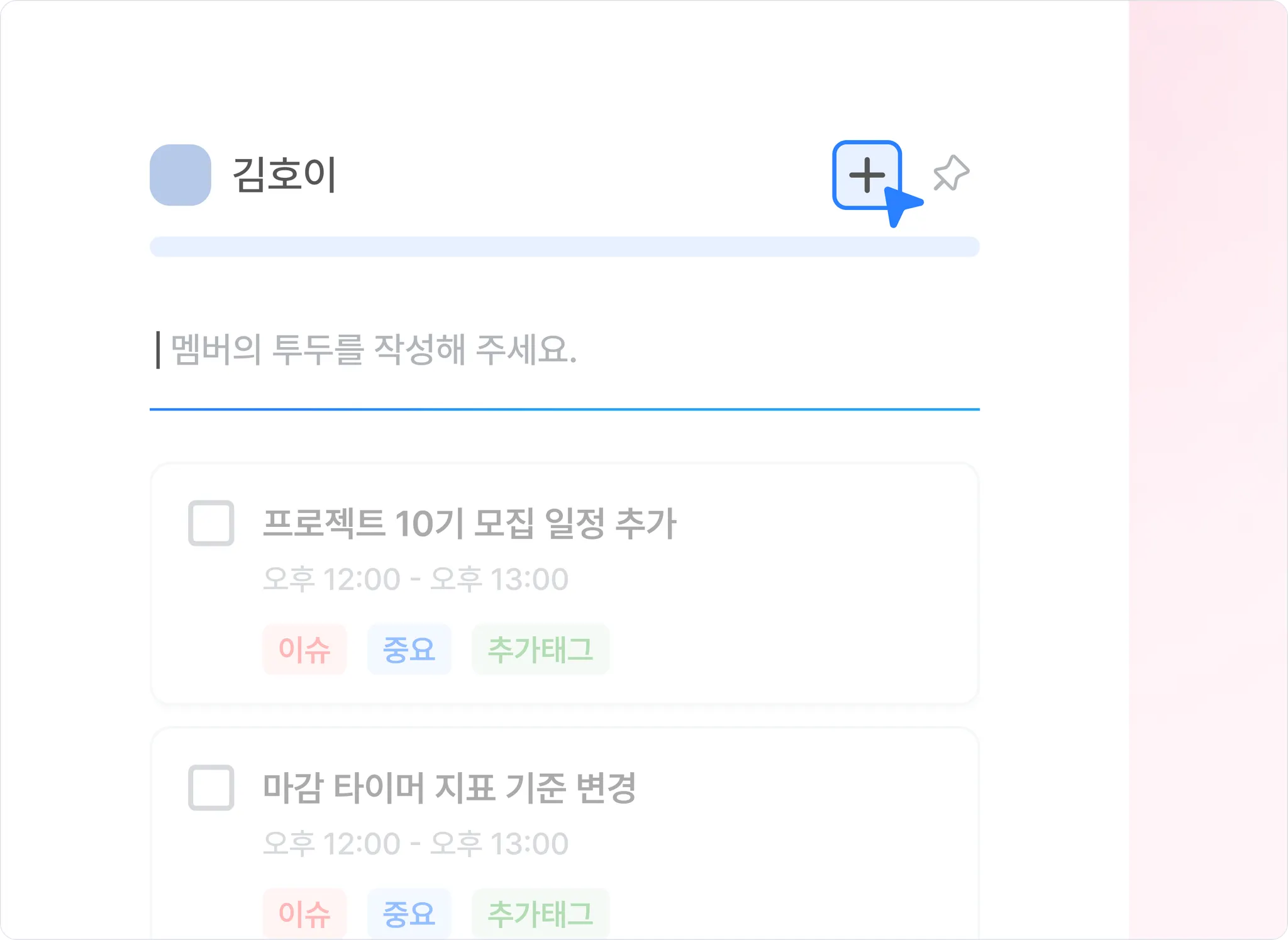 오른쪽 상단의 ‘+’버튼을 눌러 간편하게 팀원의 할 일을 요청하세요.