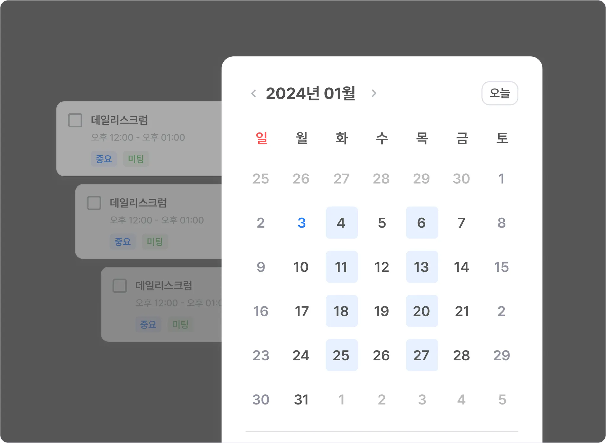 반복되는 일정을 더 편하게 등록할 수 있도록 투두복사 시 날짜를 다중 선택할 수 있도록 개선했어요.