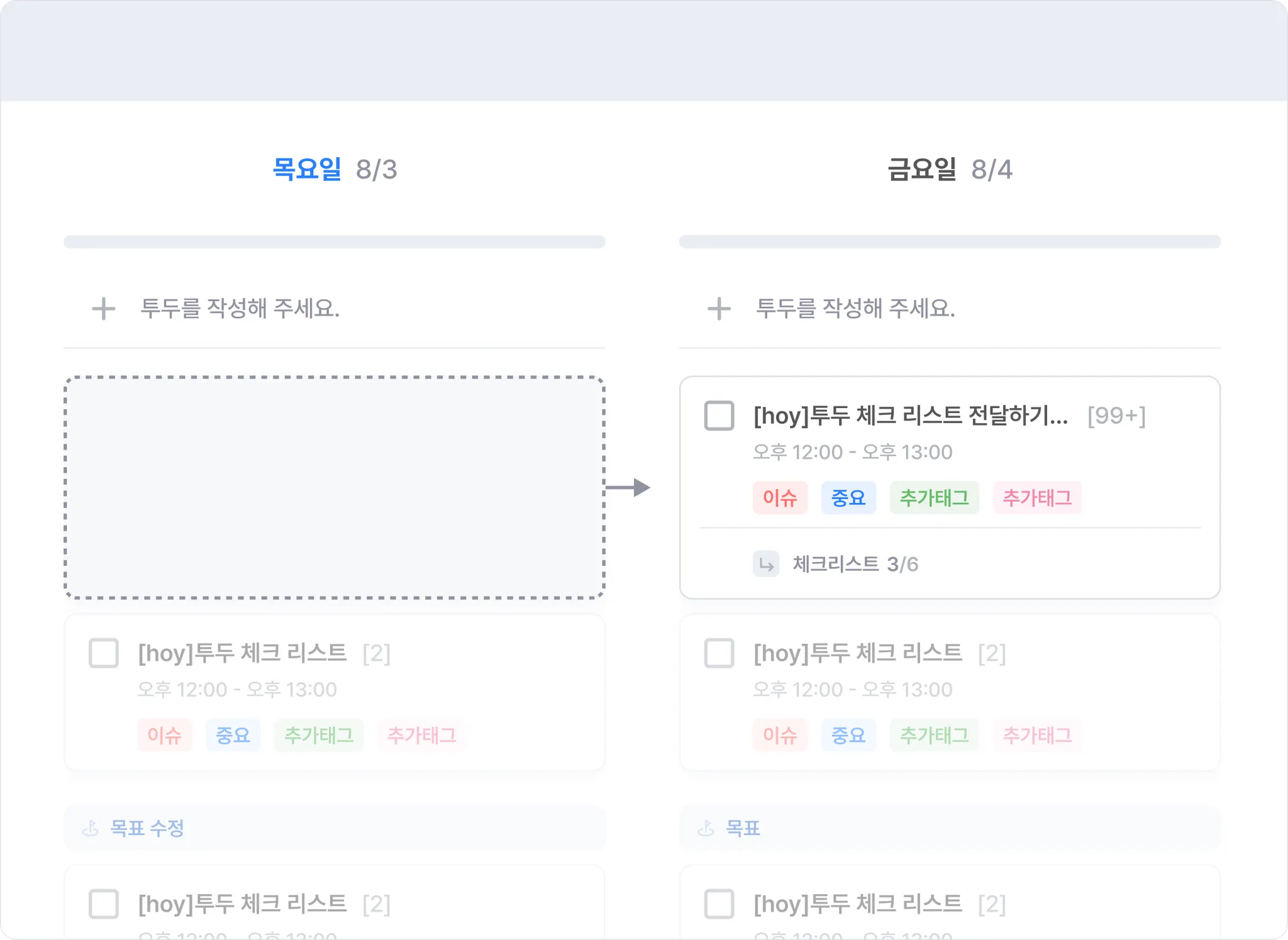 투두를 드래그 앤 드랍으로 이동시킬 때 발생하던 튕김 현상을 개선했어요. 투두 카드를 3초 이상 꾹 - 눌러 원하는 날짜로 이동시켜보세요.