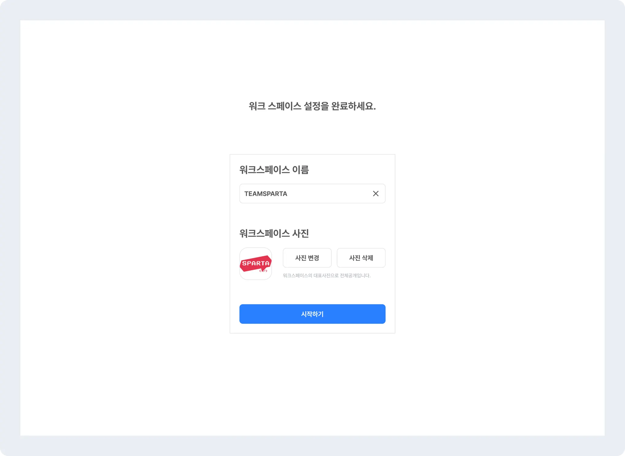 워크 스페이스 이름과 사진을 설정하고 시작하기를 누르면 워크스페이스 생성 완료!
