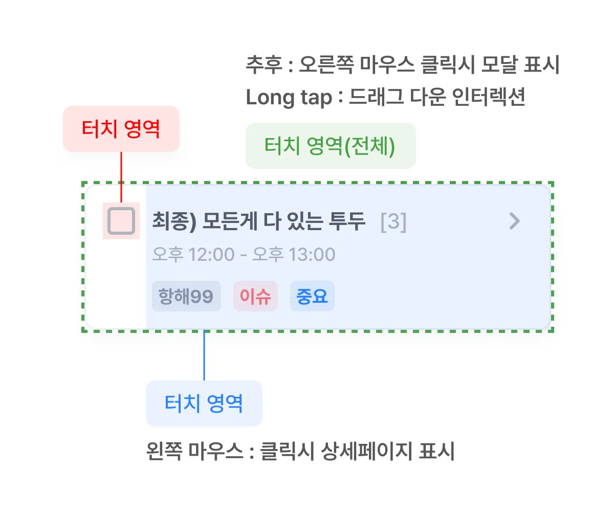 [투두 박스] 터치영역이 불분명하여, 의도하지 않은 결과를 만나게 되는 경우가 많아 혼란을 줄이기 위해 명확하게 터치 영역을 구분하였어요!